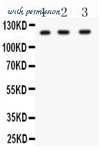 HIF 1 alpha antibody Western blot. All lanes: Anti HIF 1 alpha at 0.5 ug/ml. Lane 1: HELA Whole Cell Lysate at 40 ug. Lane 2: SHG Whole Cell Lysate at 40 ug. Lane 3: HEPA Whole Cell Lysate at 40 ug. Predicted band size: 93 kD. Observed band size: 120 kD.