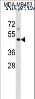 MR1 Antibody western blot of MDA-MB453 cell line lysates (35 ug/lane). The MR1 antibody detected the MR1 protein (arrow).
