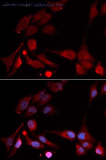 Immunofluorescence analysis of U20S cell using APBB1 antibody. Blue: DAPI for nuclear staining.