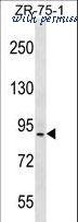 HRC Antibody western blot of ZR-75-1 cell line lysates (35 ug/lane). The HRC antibody detected the HRC protein (arrow).