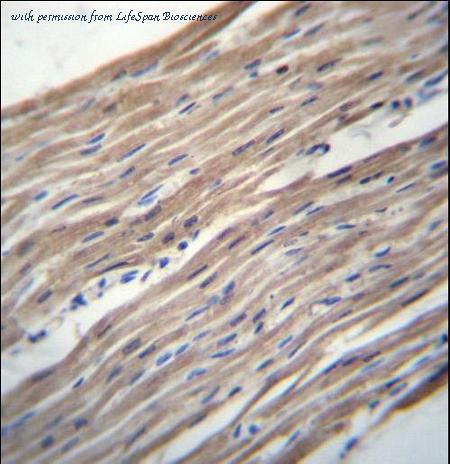 HRC Antibody immunohistochemistry of formalin-fixed and paraffin-embedded human heart tissue followed by peroxidase-conjugated secondary antibody and DAB staining.