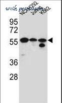 FOXN2 Antibody western blot of NCI-H292,Jurkat,K562 cell line lysates (35 ug/lane). The FOXN2 antibody detected the FOXN2 protein (arrow).