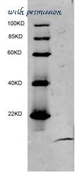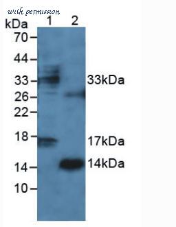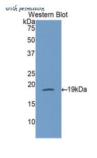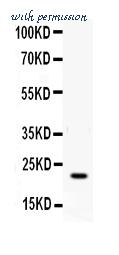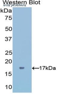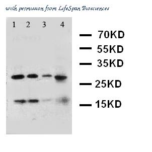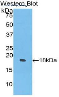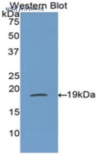 WB of IFN Gamma / Interferon Gamma antibody. Lane 1: Recombinant Human IFN? Protein 10ng. Lane 2: Recombinant Human IFN? Protein 5ng. Lane 3: Recombinant Human IFN? Protein 2.5ng. Lane 4: Recombinant Human IFN? Protein 1.25ng.