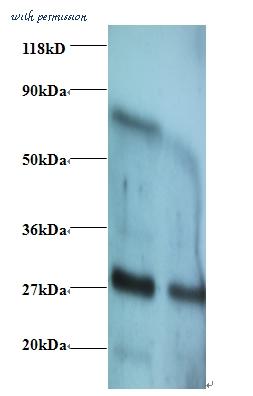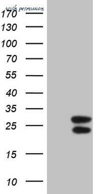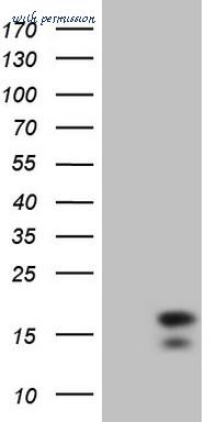 HEK293T cells were transfected with the pCMV6-ENTRY control (Left lane) or pCMV6-ENTRY IFNG (Right lane) cDNA for 48 hrs and lysed. Equivalent amounts of cell lysates (5 ug per lane) were separated by SDS-PAGE and immunoblotted with anti-IFNG (1:2000).