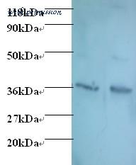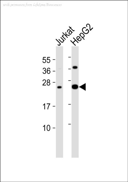 All lanes : Anti-Interferon gamma Antibody at 1:1000 dilution Lane 1: Jurkat whole cell lysates Lane 2: HepG2 whole cell lysates Lysates/proteins at 20 ug per lane. Secondary Goat Anti-Rabbit IgG, (H+L),Peroxidase conjugated at 1/10000 dilution Predicted band size : 19 kDa Blocking/Dilution buffer: 5% NFDM/TBST.