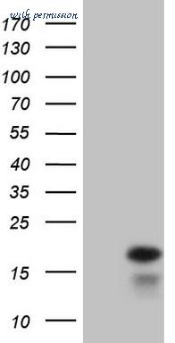 HEK293T cells were transfected with the pCMV6-ENTRY control (Left lane) or pCMV6-ENTRY IFNG (Right lane) cDNA for 48 hrs and lysed. Equivalent amounts of cell lysates (5 ug per lane) were separated by SDS-PAGE and immunoblotted with anti-IFNG.