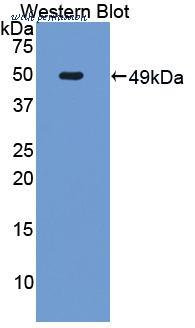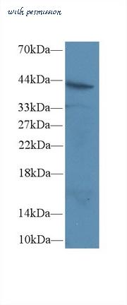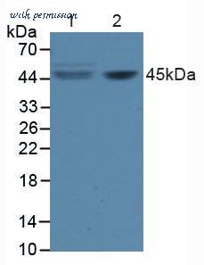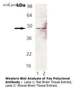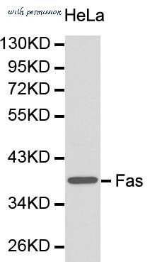 Western Blot; Sample: Human Jurkat cell lysate; Primary Ab: 2µg/ml Rabbit Anti-Rat FAS Antibody Second Ab: 0.2µg/mL HRP-Linked Caprine Anti-Rabbit IgG Polyclonal Antibody