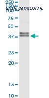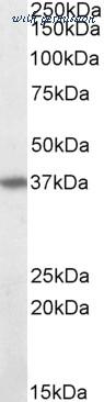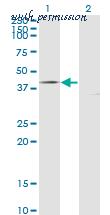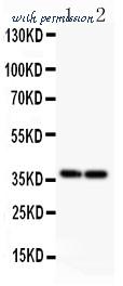 Fas antibody Western blot. All lanes: Anti Fas at 0.5 ug/ml. Lane 1: Rat Spleen Tissue Lysate at 50 ug. Lane 2: RH35 Whole Cell Lysate at 40 ug. Predicted band size: 37 kD. Observed band size: 37 kD.