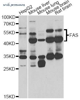 Western blot analysis of extracts of various cell lines, using FAS antibody at 1:800 dilution. The secondary antibody used was an HRP Goat Anti-Rabbit IgG (H+L) at 1:10000 dilution. Lysates were loaded 25ug per lane and 3% nonfat dry milk in TBST was used for blocking. An ECL Kit was used for detection and the exposure time was 30s.