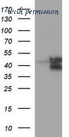 HEK293T cells were transfected with the pCMV6-ENTRY control (Left lane) or pCMV6-ENTRY FAS (Right lane) cDNA for 48 hrs and lysed. Equivalent amounts of cell lysates (5 ug per lane) were separated by SDS-PAGE and immunoblotted with anti-FAS.