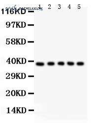 FAS antibody Western blot. All lanes: Anti FAS at 0.5 ug/ml. Lane 1: HELA Whole Cell Lysate at 40 ug. Lane 2: JURKAT Whole Cell Lysate at 40 ug. Lane 3: A549 Whole Cell Lysate at 40 ug. Lane 4: SMMC Whole Cell Lysate at 40 ug. Lane 5: K562 Whole Cell Lysate at 40 ug. Predicted band size: 37 kD. Observed band size: 37 kD.