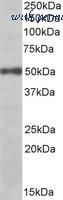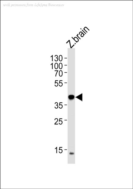 (DANRE) eif3eb Antibody western blot of zebra fish brain tissue lysates (35 ug/lane). The (DANRE) eif3eb antibody detected the (DANRE) eif3eb protein (arrow).
