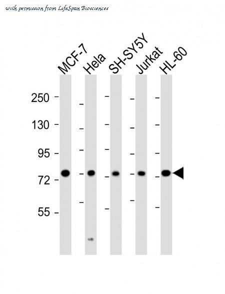 All lanes : Anti-KIF22 Antibody at 1:2000 dilution Lane 1: MCF-7 whole cell lysates Lane 2: HeLa whole cell lysates Lane 3: SH-SY5Y whole cell lysates Lane 4: Jurkat whole cell lysates Lane 5: HL-60 whole cell lysates Lysates/proteins at 20 ug per lane. Secondary Goat Anti-Rabbit IgG, (H+L), Peroxidase conjugated at 1/10000 dilution Predicted band size : 73 kDa Blocking/Dilution buffer: 5% NFDM/TBST.