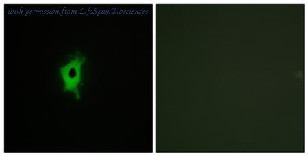 Immunofluorescence analysis of COS7 cells, using LEG2 Antibody. The picture on the right is blocked with the synthesized peptide.