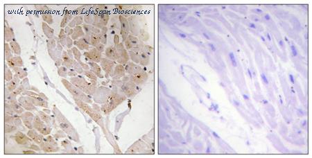 Immunohistochemistry analysis of paraffin-embedded human heart tissue, using LEG2 Antibody. The picture on the right is blocked with the synthesized peptide.