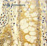 Formalin-fixed and paraffin-embedded human colon carcinoma reacted with LGALS2 Antibody , which was peroxidase-conjugated to the secondary antibody, followed by DAB staining. This data demonstrates the use of this antibody for immunohistochemistry; clinical relevance has not been evaluated.