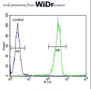 LGALS2 Antibody flow cytometry of WiDr cells (right histogram) compared to a negative control cell (left histogram). FITC-conjugated goat-anti-rabbit secondary antibodies were used for the analysis.