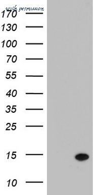 HEK293T cells were transfected with the pCMV6-ENTRY control (Left lane) or pCMV6-ENTRY LGALS2 (Right lane) cDNA for 48 hrs and lysed. Equivalent amounts of cell lysates (5 ug per lane) were separated by SDS-PAGE and immunoblotted with anti-LGALS2.