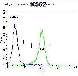 LIPC Antibody flow cytometry of K562 cells (right histogram) compared to a negative control cell (left histogram). FITC-conjugated goat-anti-rabbit secondary antibodies were used for the analysis.