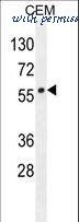 LIPC Antibody western blot of CEM cell line lysates (35 ug/lane). The LIPC antibody detected the LIPC protein (arrow).