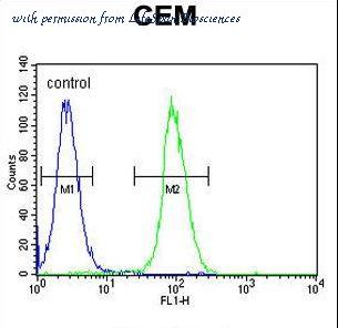 LIPC Antibody flow cytometry of CEM cells (right histogram) compared to a negative control cell (left histogram). FITC-conjugated goat-anti-rabbit secondary antibodies were used for the analysis.