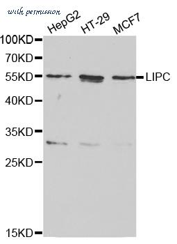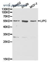 Western blot analysis of extracts of various cell lines, using LIPC antibody at 1:1000 dilution. The secondary antibody used was an HRP Goat Anti-Rabbit IgG (H+L) at 1:10000 dilution. Lysates were loaded 25ug per lane and 3% nonfat dry milk in TBST was used for blocking.