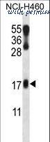 LMO2 Antibody western blot of NCI-H460 cell line lysates (35 ug/lane). The LMO2 antibody detected the LMO2 protein (arrow).