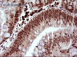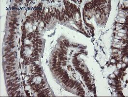 IHC of paraffin-embedded Adenocarcinoma of Human colon tissue using anti-LMO2 mouse monoclonal antibody. (Heat-induced epitope retrieval by 10mM citric buffer, pH6.0, 120°C for 3min).