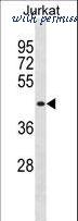 MBNL1 Antibody western blot of Jurkat cell line lysates (35 ug/lane). The MBNL1 antibody detected the MBNL1 protein (arrow).