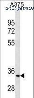 MC1R Antibody western blot of A375 cell line lysates (35 ug/lane). The MC1R antibody detected the MC1R protein (arrow).