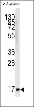 Western blot of anti-MGST1 antibody in K562 cell line lysates (35 ug/lane). MGST1 (arrow) was detected using the purified antibody.