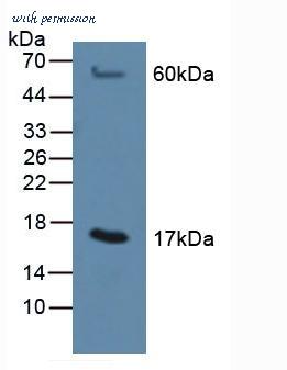 Western blot of MGST1 (R74) pAb in extracts from HeLa cells.