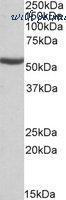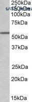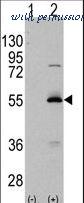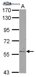 Western blot of ALDH6A1 (arrow) using rabbit polyclonal ALDH6A1 Antibody (RB11957). 293 cell lysates (2 ug/lane) either nontransfected (Lane 1) or transiently transfected with the ALDH6A1 gene (Lane 2) (Origene Technologies).