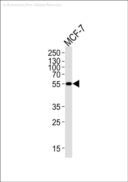 ALDH6A1 Antibody western blot of MCF-7 cell lysate (35 ug/lane). This demonstrates that the ALDH6A1 antibody detected ALDH6A1 protein (arrow).