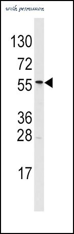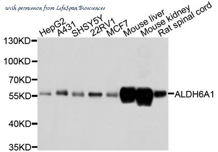 Western blot of ALDH6A1 Antibody in T47D cell line lysates (35 ug/lane). ALDH6A1 (arrow) was detected using the purified antibody.