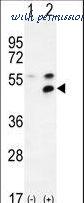 Western blot of MPP1 (arrow) using rabbit polyclonal MPP1 Antibody. 293 cell lysates (2 ug/lane) either nontransfected (Lane 1) or transiently transfected (Lane 2) with the MPP1 gene.