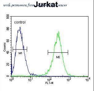 MPP1 Antibody flow cytometry of Jurkat cells (right histogram) compared to a negative control cell (left histogram). FITC-conjugated goat-anti-rabbit secondary antibodies were used for the analysis.