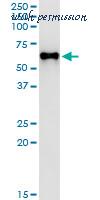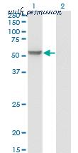 Western Blot analysis of MPP1 expression in transfected 293T cell line by MPP1 monoclonal antibody (M01), clone 1E11-1G11.Lane 1: MPP1 transfected lysate (Predicted MW: 52.3 KDa).Lane 2: Non-transfected lysate.