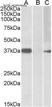 HEK293 lysate (10ug protein in RIPA buffer) overexpressing Human MYF6 with MYC tag probed with (0.5ug/ml) in Lane A and probed with anti-MYC Tag (1/1000) in lane C. Mock-transfected HEK293 probed (0.5mg/ml) in Lane B. Primary incubati