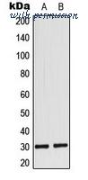 Western blot analysis of MYF6 expression in MCF7 (A); rat heart (B) whole cell lysates.