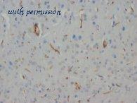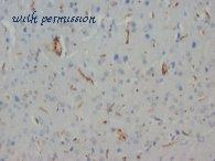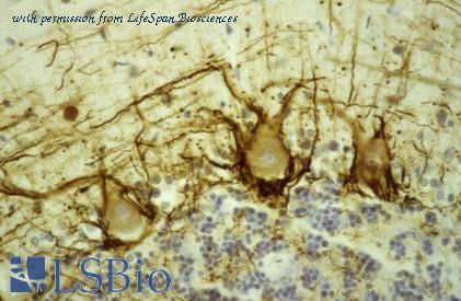 Human cerebellar cortex fixed in formalin, embedded in paraffin and stained with NEFH / NF-H antibody using the ABC (avidin biotin conjugate) method. The section was counterstained with hematoxylin-Eosin (blue). NEFH / NF-H antibody stains prominent basket cell axons surrounding the large Purkinje neurons. Granule cell layer at bottom of image, molecular layer at top.