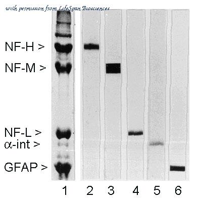 Rat spinal cord homogenate showing the major intermediate filament proteins of the nervous system (lane 1). The remaining lanes show blots of this material stained with various antibodies including NEFH / NF-H antibody (lane 2).