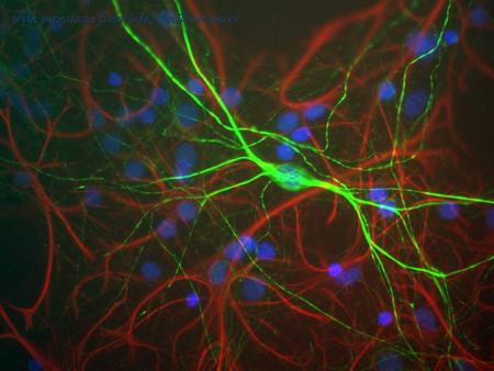 Mixed neuron/glial cultures stained with NEFH / NF-H antibody (red) and rabbit GFAP antibody RPCA-GFAP (green). Axonal profiles are stained in red, while astrocytic cells are revealed in green. Nuclei are revealed with a fluorescent DNA stain (blue).