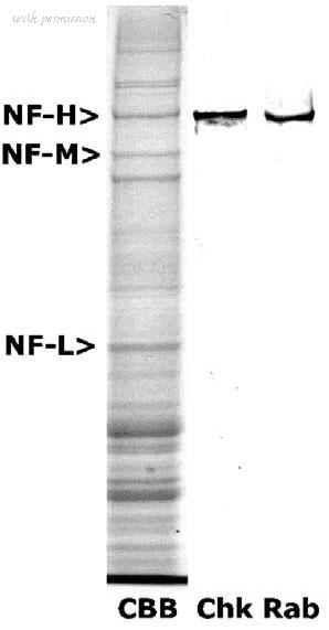 CBB shows lane of Coomassie Brilliant Blue stained crude extract of rat spinal cord, with the prominent major neurofilament subunit indicated; In rodents, NF-H runs at ~200kDa, NF-M at ~145kDa and NF-L at ~68kDa; in larger species such as pig or human, NF-H runs somewhat slower at ~210kDa or 220kDa. The Chk lane shows a blot probed with chicken anti NF-H antibody NEFH / NF-H antibody. A prominent band at an apparent SDS-PAGE molecular weight of 200kDa corresponds to phosphorylated form of NF-H. The lane marked Rab shows a similar blot probed with our rabbit antibody to NF-H, RPCA-NF-H.