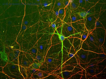 Mixed neuron/glial cultures stained with NEFH / NF-H antibody (green) and also stained with rabbit polyclonal antibody to neurofilament NF-L RPCA-NF-L (red). The NF-L antibody stains neurofilaments in both axons and dendrites, and so can reveal neuronal cell bodies, while NEFH / NF-H antibody binds to only heavily phosphorylated forms of NF-H which are localized to mature axonal neurofilaments. In this image a few axons course from left to right and top to bottom- since they contain both NF-L and phosphorylated NF-H they appear golden in color. Blue shows the distribution of DNA.