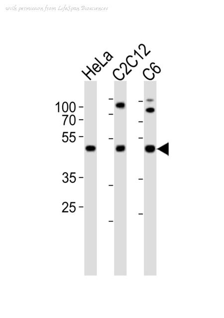 Western blot of lysates from HeLa, mouse C2C12, rat C6 cell line (from left to right) with PAFAH1B1 Antibody. Antibody was diluted at 1:1000 at each lane. A goat anti-rabbit IgG H&L (HRP) at 1:10000 dilution was used as the secondary antibody. Lysates at 20 ug per lane.