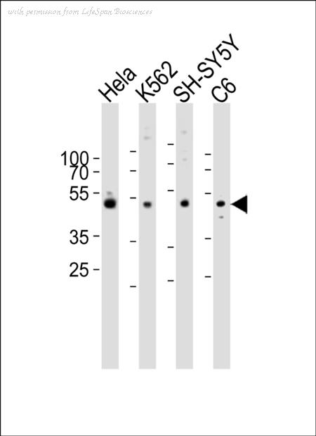 Western blot of lysates from HeLa, K562, SH-SY5Y, rat C6 cell line (from left to right) with PAFAH1B1 Antibody. Antibody was diluted at 1:1000 at each lane. A goat anti-rabbit IgG H&L (HRP) at 1:10000 dilution was used as the secondary antibody. Lysates at 20 ug per lane.