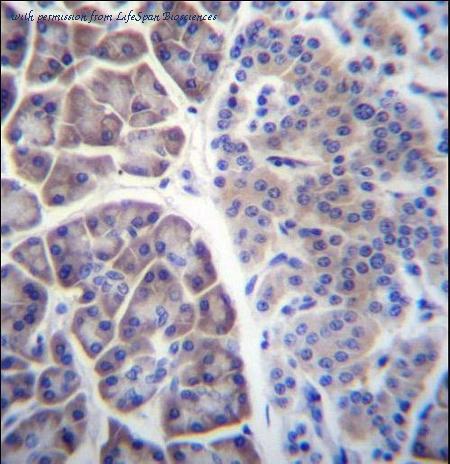 Immunohistochemistry of paraffin-embedded human pancreas using antibody at 1:100 dilution.