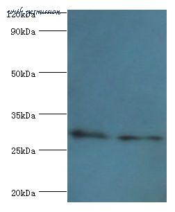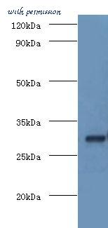western blot All lanes: COP9 signalosome complex subunit 7a antibody at 2 ug/ml+mouse brain tissue. Secondary antibody: Goat polyclonal to rabbit at 1:10000 dilution. Predicted band size: 30 kDa. Observed band size: 30 kDa. This image was taken for the unconjugated form of this product. Other forms have not been tested.