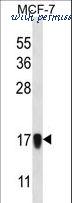 NDUFA13 Antibody western blot of MCF-7 cell line lysates (35 ug/lane). The NDUFA13 antibody detected the NDUFA13 protein (arrow).